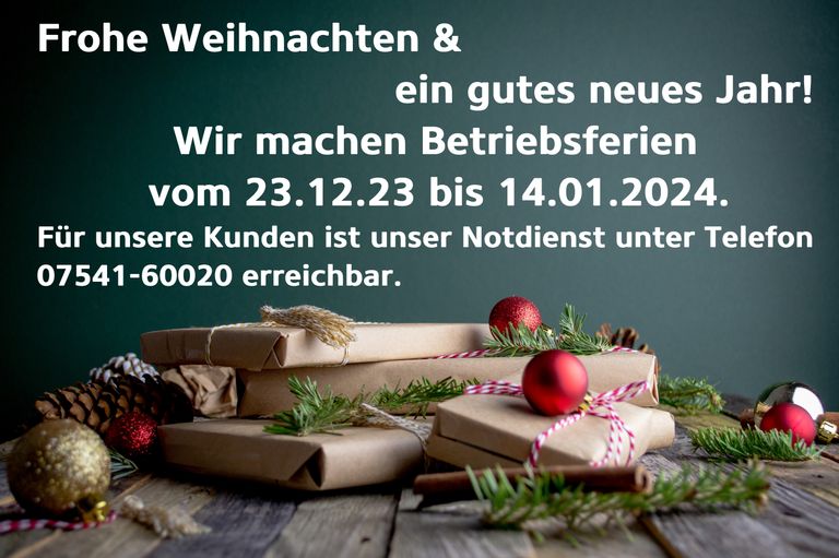 Wir machen Betriebsferien uns sind ab 15. Januar 2024 wieder für Sie da!Für unsere Kunden bieten wir einen Notdienst unter Telefon 07541-60020.