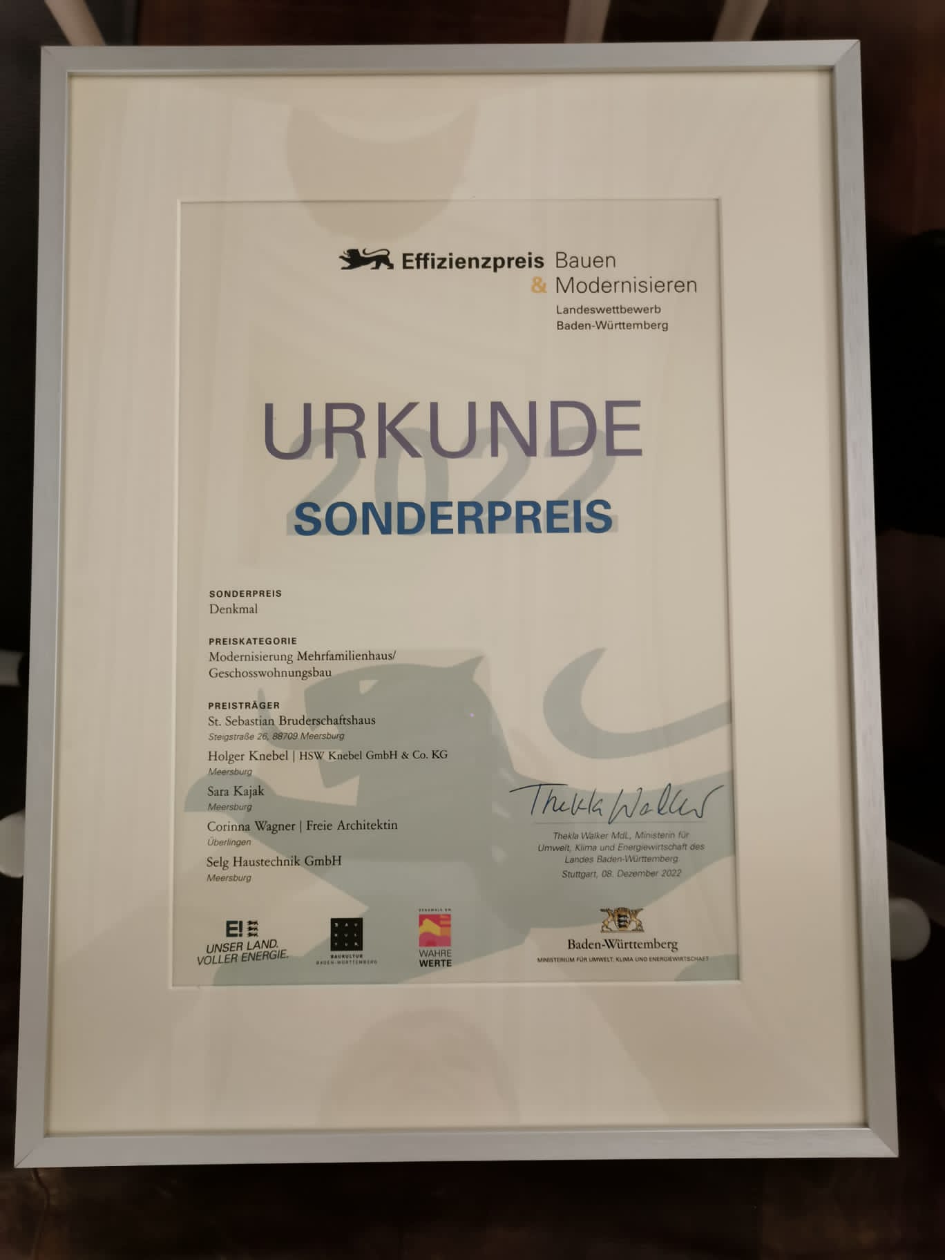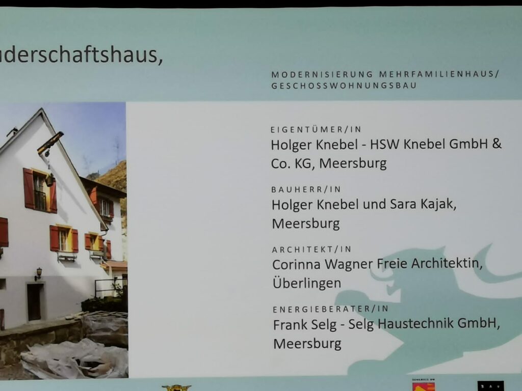 Unser Innungsmitglied Fa. Selg Haustechnik GmbH aus Meersburg hat am 08.12.2022 einen Sonderpreis Denkmal in der Kategorie Modernisierung Mehrfamilienhaus/Geschosswohnungsbau erhalten. – Herzlichen Glückwunsch!!!