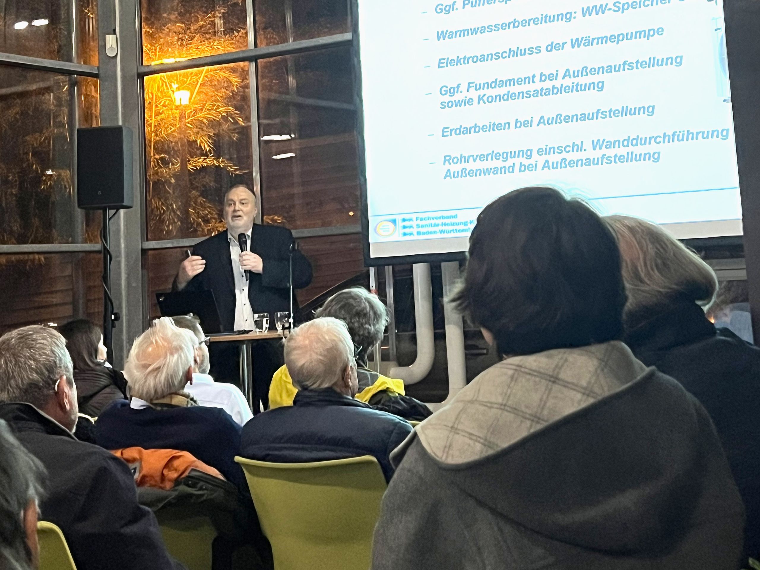 Wie kann die Wärmewende im eigenen Zuhause gelingen? Zu dieser Frage hatten die SHK-Innungen Bodenseekreis und Konstanz Anfang Februar gemeinsam mit der Stadt Überlingen einen Info-Abend organisiert. Rund 100 Interessierte kamen, um unter anderem den Vortrag von Jörg Knapp zu hören, Referatsleiter Technik beim Fachverband Sanitär-Heizung-Klima Baden-Württemberg. Im Mittelpunkt des Abends stand die Wärmepumpe – auch, weil die Stadt derzeit gemeinsam mit dem Stuttgarter Start-up 5 Prozent und den Innungen eine Bündelungsaktion für Wärmepumpen organisiert, also eine Art Sammelbestellung. Bei einer ersten Aktion für Photovoltaik im vergangenen Jahr hatte man auf diese Weise etwa 100 Interessenten in Überlingen gewonnen.