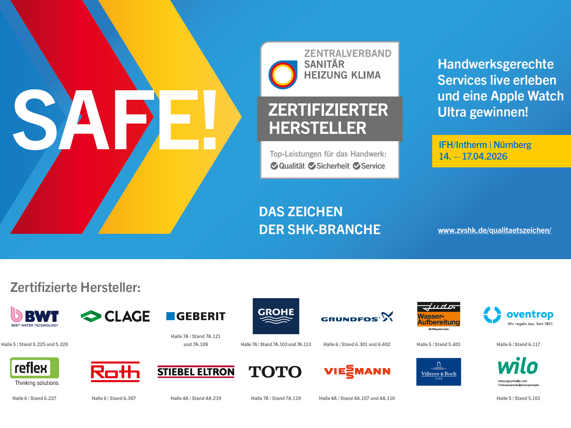 Erfahren Sie mehr über das ZVSHK-Qualitätszeichen und wie Sie mit dem QZ im Alltag einfach SAFE! sind vom 14. bis 17 April bei der IFH/Intherm im Messezentrum Nürnberg. Sichern Sie sich außerdem bei der großen QZ-Rallye die Chance auf ein Paar Apple Air Pods oder eine Apple Watch Ultra als Hauptgewinn! Teilnahme-Flyer gibt es bei den Ständen der QZ-Aussteller (siehe Foto oben) und am Stand der Fachverbände 4.213 in Halle 4. Dort befindet sich auch die Losbox, um ausgefüllte Teilnahmekarten einzuwerfen.